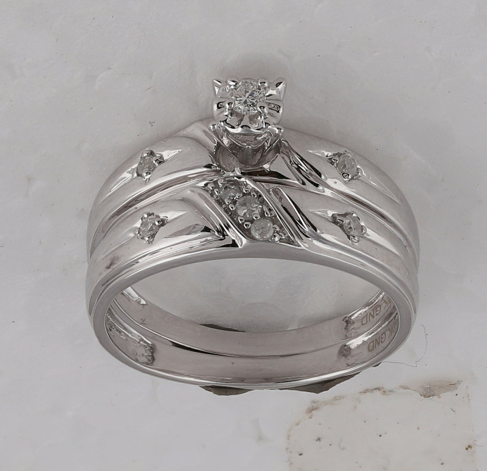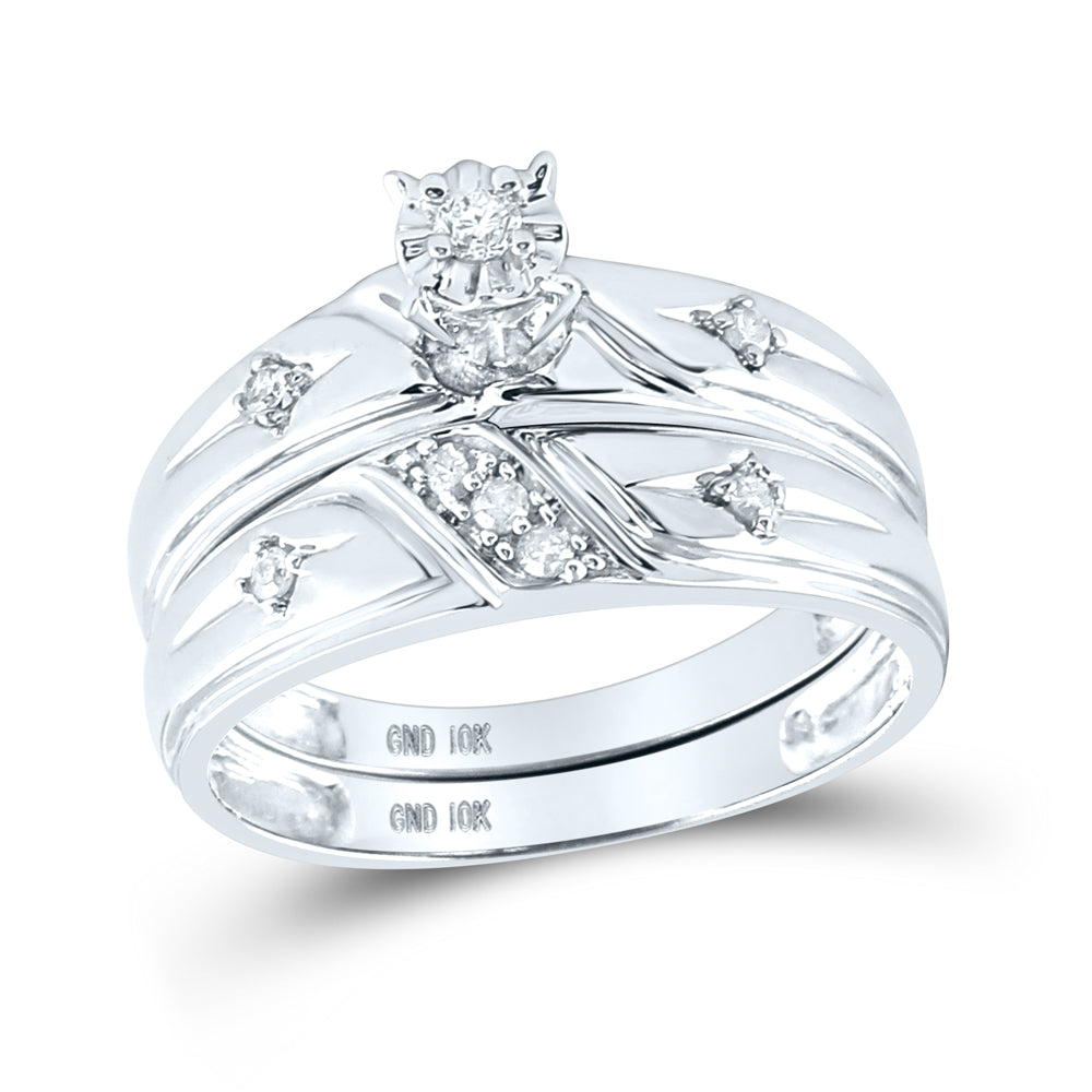 10kt White Gold His & Hers Round Diamond Solitaire Cross Matching Bridal Wedding Ring Band Set 1/6 Cttw